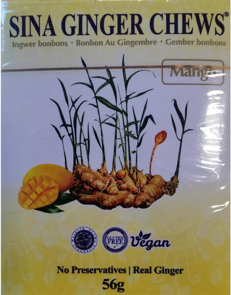 Sina Ginger Mango rágós gyömbéres cukorka 56g Exkluzív rágócukorkák praktikus csomagolásban. Meleg gyömbéres cukorkák mangó ízzel. Hozzávalók: Nádcukor, gyömbér 7%, tápiókakeményítő, mangó aroma. Mangó kivonat 0,1%. Dióféléket és szezámmagot feldolgozó üzemben készült. Energiaérték 100 grammonként: Energia 1628 kJ/389 kcal. Zsírok 1,4 g ebből telített 0,78