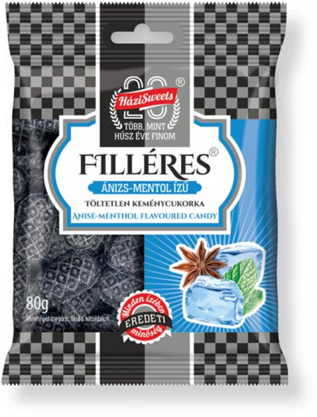Filléres cukor 80g ánizs házisweets Hivatalos magyarországi forgalmazótól. Összetevők: Cukor, glükózszirup, kristálymentol, ánizs aroma, színezék: növényi szén. Tápértékre vonatkozó adatok: Átlagos tápérték 100g termékben: Energia (g): 1469kJ/346 kcal Zsír (g): 0,1 g amelyből telített zsírsavak (g): 0,04 g Szénhidrát (g): 86 g amelyből cukrok (g): 76,1 g Fehérje