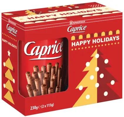 Caprice Papadopoulos Tubes Xmass Pack 2x115g Legendás ropogós csövek limitált karácsonyi kiadásban Hozzávalók: Cukor, búzaliszt , növényi olajok: (pálmaolaj, pálmamagolaj, shea vaj). Laktóz , mogyorópaszta 6%, zsírtalanított kakaópor 3,5%. Tejfehérjék , stabilizátor (szorbit szirup). Keményítő, fruktóz, sovány tejpor . Színezék (ammónia karamell), élelmi rost, só. Em