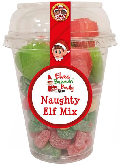 Elves Behavin Badly Naugthy Elf Mix gumicukor válogatás. töltőtömeg: 210g Összetevők: Jelly Candy Canes: glükózszirup, cukor, kukoricakeményítő, víz, sav (E330), savanyúságot szabályozó anyag (E331), aroma, színezékek (E133, E129, E102). Jelly Elves: glükózszirup, cukor, kukoricakeményítő, zselatin (sertés, marhahús), sav (E270), aromák, zselésítő anyag (E440), fénye