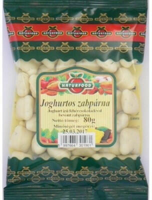 Termék leírása: fehér csokoládé 77% (cukor, kakaóvaj, teljes tejpor, laktóz, sovány tejpor, emulgeálószer: szójalecitin, vanília aroma), zabpárna 23% (zabliszt, rizsliszt, cukor, árpa maláta kivonat, só), sűrítőanyag: gumiarábikum, joghurt aroma Fénytől védve, száraz, hűvös helyen tartandó. 100g termékre vonatkoztatva: Energia kJ/kcal: 2121/506 Zsír: 24g amelyből tel
