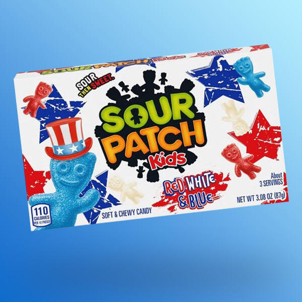 Sour Patch Kids Red White Blue édes-savanyú gumicukor töltőtömeg: 87g Savanyúnak indul, de ígérjük, hogy édes lesz! Összetevők: cukor, invertcukor, kukoricaszirup, módosított kukoricakeményítő, kevesebb mint 2%-ban tartalmaz: savanyítószert (borkősav, citromsav), természetes és mesterséges aromát, színezéket (E129, E133). Biológiailag módosított élelmiszer-összetevő