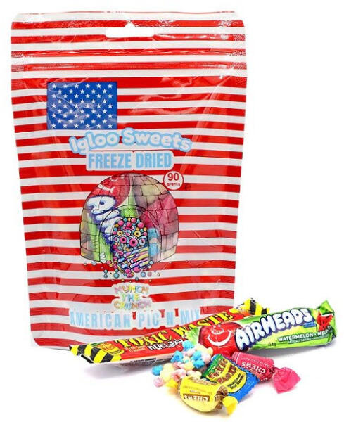 Igloo American Pic n Mix Freeze Dried Sweets fagyasztva szárított cukorka válogatás. töltőtömeg: 90g Összetevők: Glükózszirup, cukor, kukoricakeményítő, sertés- és marhahús zselatin, sav (tejsav), aromák, zselésítő anyag (pektinek), növényi olajok (pálma), fényezőanyag (méhviasz, karnaubaviasz), színezékek (E129), glükóz-fruktóz Szirup, cukor, víz, sertéshús zsel