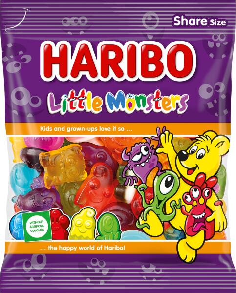 Haribo Little Monsters gyümölcsízű gumicukorka részben habosított gumicukorka réteggel 160 g Hivatalos magyarországi forgalmazótól. Összetevők: Glükózszirup, Cukor, Dextróz, Zselatin, Étkezési sav: citromsav, Gyümölcs- és növényi sűrítmények: sárgarépa, spirulina, alma, retek, paprika, édesburgonya, fekete ribizli, paradicsom, hibiszkusz, Napraforgóolaj, Aromák, Fény