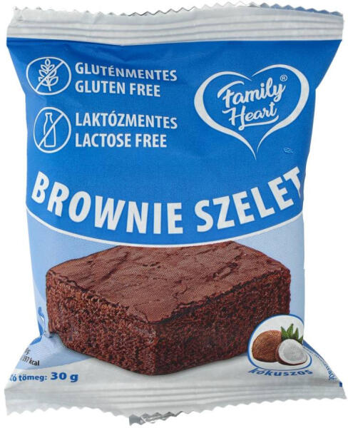 Family Heart gluténmentes és laktózmentes brownie szelet, kókuszízben. Ideális választás gyors energiapótlásra, és garantáltan kielégíti az édesség utáni vágyat!