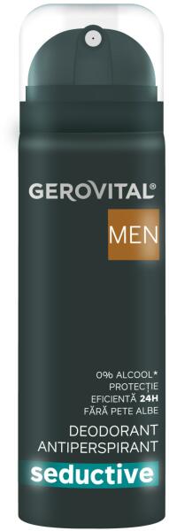 Gerovital Men Seductive dezodor spray, 150 ml Az egyedülálló alkoholmentes* dezodor-izzadásgátló formula hosszan tartó férfias illattal egész nap hatékony védelmet nyújt az izzadás ellen. A fás-aromás illat kifinomultságot és hitelességet sugall. A gyömbér az illat csúcsán a levendula, a pézsma és a zsálya eleganciájának és kifinomultságának előjátéka. A cédrusfa