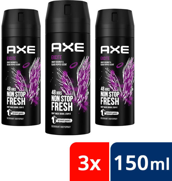 Az Axe Excite segítségével még közelebb kerülsz a csajok meghódításához. Használatával akár 48 órán át friss maradhatsz és Dual Action technológiával segít védeni a baktériumok okozta kellemetlen szagok ellen és ellenállhatatlan illatával csábít. AXE deo Excite 3x150 ml Termék jellemzők: - Férfi aeroszol - Dual Action technológiával - Kellemes illat - Védelem a sza