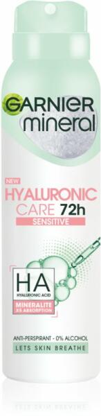 Termékleírás izzadásgátló spray Garnier Mineral Hyaluronic Care 72h Sensitive optimálisan felszívja az izzadságot és semlegesíti a szagokat megnyugtatja az érzékeny hónaljat, és akár 72 órán keresztül véd a szagoktól növényi eredetű hialuronsavval és Mineralittal dúsított ideális az érzékeny bőr számára, komfortérzetet kelt A Garnier Mineral Hyaluronic Care Sensit