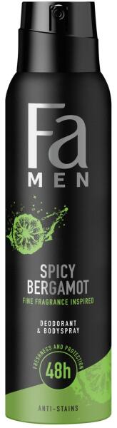 Fa Men Spicy Bergamot deospray 150 mlFrissítsd fel a tested és az elméd, és hagyd, hogy érzékeid minden nap egy másik világot fedezzenek fel a Fa Men Spicy Bergamot deospray fűszeres bergamot illatával. Foltmentes technológiával, hosszan tartó testszag elleni védelemmel. Bőrbarát formula. Vegán formula**állati eredetű összetevőktől mentes ÖsszetevőkButaneAlcohol denat. Prop