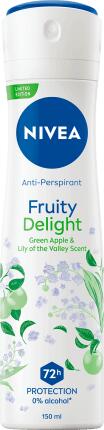 Termékleírás izzadásgátló nőknek Nivea Fruity Delight megbízható 72 órás izzadságvédelem biztosítja a hónalj bőrének ápolását zöldalma és liliom frissítő illatával frissesség és tisztaság érzetét kelti minden nap A NIVEA Fruity Delight női izzadásgátló spray 72 órán keresztül hatékonyan véd az izzadás és a kellemetlen testszag ellen, valamint friss és tisz
