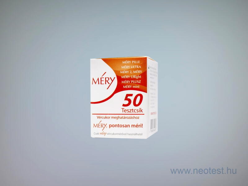 Méry vércukorszint mérő tesztcsík 50db/doboz A Méry -PILLE, -ULTRA -2, -MINI, Méry, - URIGHT és PLUSZ vércukormérővel használható! 0123