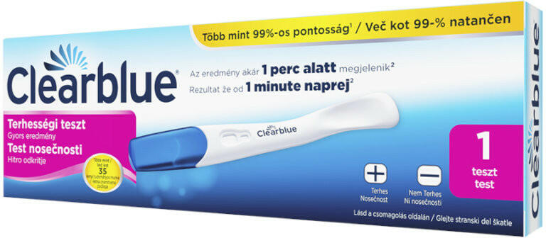 1 db vizeletsugaras terhességi teszt. Normál érzékenység ( 25 mIU/ml ) Lejárat: 2026. április Önellenőrzésre szolgáló in vitro diganosztikai eszköz. A Clearblue terhességi teszt gyors eredmény a legkönnyebben használható terhességi teszt, emellett a Clearblue pontosságát is nyújtja és az eredmény akár 1 perc alatt megjelenik. Forradalmian új kialakítása a nők körében