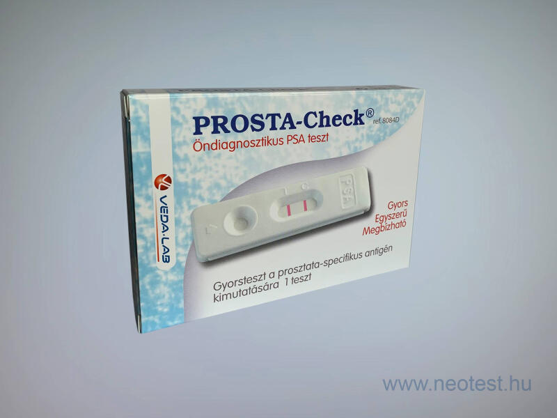 A Prosta-Check prosztata gyorstesztet a PSA (prosztata specifikus antigén) otthoni, gyors vizsgálatához fejlesztették ki. A PSA (prostata spec a. ) egy olyan fehérje, mely kizárólag a prosztatában termelődik. A vérben megtalálható szérumszintje a prosztataszövet térfogatával arányos. Mennyiségének meghatározása prosztatabetegségek (jóindulatú megnagyobbodás, prosztatarák)