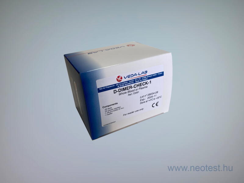 Immunokromatográfiás gyorsteszt a D-DIMER kvantitatív kimutatására teljes vérben vagy plazmában Minta: plazma/teljes vér Mérési tartomány: 250 - 5 000 ng/ml FEU A teszt elvégzéséhez nincs szükség mérőműszerre! Az eredmény a tesztkazettáról vizuálisan leolvasható. A teszt használható Reader plus analizáló gépben is. A doboz tartalma: 20 db D-dimer-check1 1 kazetta, 5 ml