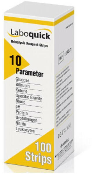 Termék leírása: - 100 db/doboz - vizelet tesztcsik az alábbi paraméterek meghatározására: 1, urobilinogen 17-200 mg/ml (meghatárotási idő:60s) 2, cukor 5-110 mmol/l (meghatárotási idő:30s) 3, bilirubin 17-70 mmol/l (meghatárotási idő:30s) 4, keton 0,5-16 mmol/l (meghatárotási idő:40s) 5, vér +-50 erytr/mikroL (meghatárotási idő:60s) 6, pH 5-9 pH (meghatárotási idő:60s) 7