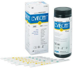 Termékleírás: Cybow 9 tesztcsík. A CYBOW reagens tesztcsíkokat vizeletbe kell meríteni majd leolvasni az eredményt. . A teszt eredménye információt adhat a szénhidrát anyagcsere állapotáról, a vese és a máj funkciókról, a sav-bázis egyensúlyról és a húgyutak fertőzésesekről. A vizeletbe mártott tesztcsíkot össze kell hasonlítani a dobozon lévő színskálával. A te