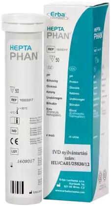 A HeptaPHAN diagnosztikai tesztcsík a vizelet vér-, keton-, bilirubin-, urobilinogén-, glükóz- és fehérjetartalmának, valamint pH értékének félkvantitatív meghatározására szolgál. A tesztcsík az általános egészségi állapot ellenőrzésére, anyagcserezavarok