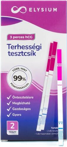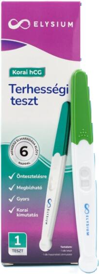 Elysium HCG korai kimutatású terhességi gyorsteszt a terhesség korai szakaszának felismerésére, 10 mIU/ml speciális terhességi hormonszint (hCG) vagy a feletti kimutatására. A doboz 1 db öntesztelésre készült, magas érzékenységű gyorstesztet tartalmaz.