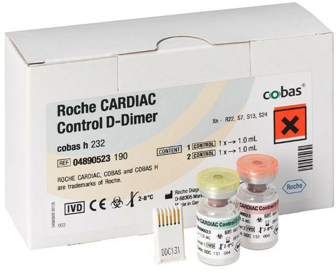 Roche CARDIAC Control D-Dimer a cobas h232 funkcionális ellenőrzésére a CARDIAC D-Dimer tesztcsíkokkal kombinálva. A liofilizált kontrollszérumot desztillált vízben oldjuk fel, és az eredeti palackban akár 5 alkalommal is lefagyasztható. Roche CARDIAC Control D-Dimer a cobas h232 funkcionális ellenőrzésére a CARDIAC D-Dimer tesztcsíkokkal kombinálva. A liofilizált kontrollszér