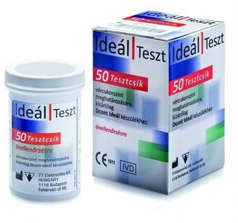 - D-Cont IDEÁL, és D-Cont TREND készülékekhez - 50db/doboz - Önellenőrzésre - 15 hónap eltarthatóság (gyártástól számítva) - Előnye: a lejárati időt nem rövidíti a felbontás - Tesztcsík kvantitatív vércukorméréshez friss kapilláris, továbbá Li-heparinos vagy EDTA-s vénás vérből. - Az Ideál Teszt tesztcsík által kimutatott eredmény megegyezik a plazma vércukor