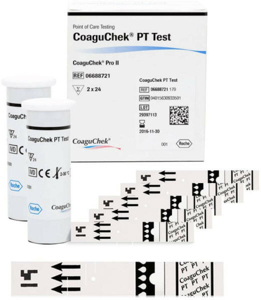 Heparinszuppresszáló CoaguChek PT tesztcsíkok a CoaguChek Pro II véralvadásmérővel való használatra. A vér felvitele egyaránt történhet felülről vagy oldalról. Heparinszuppresszáló CoaguChek PT tesztcsíkok a CoaguChek Pro II véralvadásmérővel való használatra. A vér felvitele egyaránt történhet felülről vagy oldalról. CoaguChek PT tesztcsíkok A CoaguChek Pro II vé
