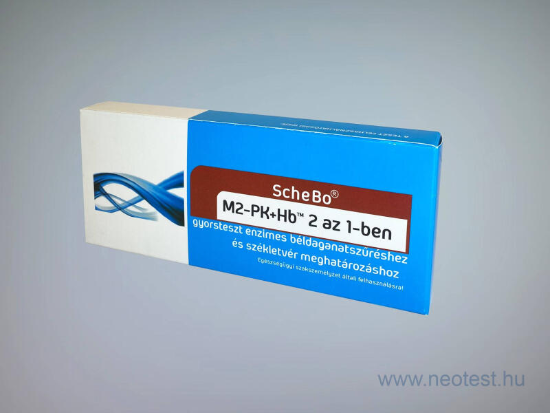 A ScheBo® M2-PK 2 az 1-ben Quick gyorsteszt enzimes béldaganatszűréshez béldaganatok azonnal kivitelezett szűrésére szolgál. A vizsgálatot a megrendelőnek kell elvégeznie a dobozba lévő utasításnak megfelelően. A „ScheBo® 2:1-ben Quick gyorsteszt gombostűfejnyi székletmintából tumor M2-PK enzimszint és humán hemoglobin (vér) meghatározás céljára szolgál. Ez a két