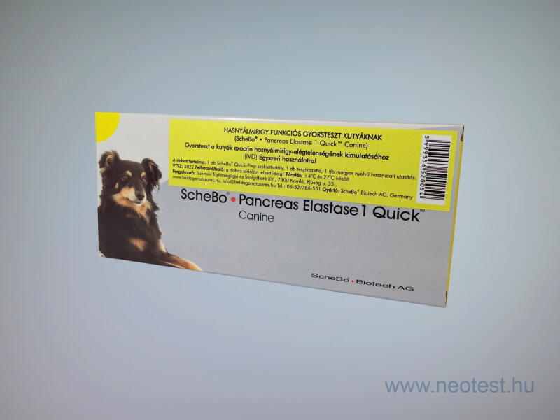 Székletteszt a kutyák (exocrin) hasnyálmirigy-elégtelenségének kimutatásához ÚJ TESZT MAGYARORSZÁGON! A ""Hasnyálmirigy funkciós gyorsteszt kutyáknak"" (ScheBo Pancreas Elastase 1 Quick Canine) egy pár perc alatt otthon is értékelhető gyorstesztes eljárás a kutyák hasnyálmirigye által termelt egyik fehérjebontó enzimének, az elastase 1-nek a székletmintában történő ki