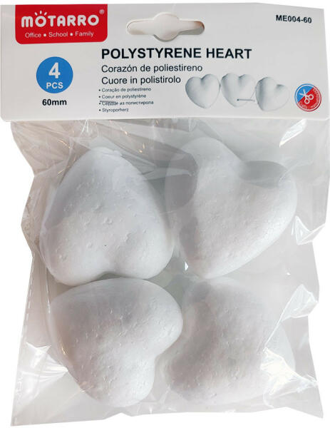 Festhető, dekorálható 60 mm-es Hungarocell szív. Egy csomag 4 db hungarocell szívet tartalmaz. A hungarocell szívek rendkívűl népszerű hobbi alapanyagok. Felhasználásuk nagyon sokrétű lehet. Ebben a szettben 4 db 60 mm hungarocell szív található, melyek festhetőek, ragaszthatóak vagy egyéb kreatív módon felhasználhatóak az ügyes kezű alkotóknak. Gyakran készülnek belő