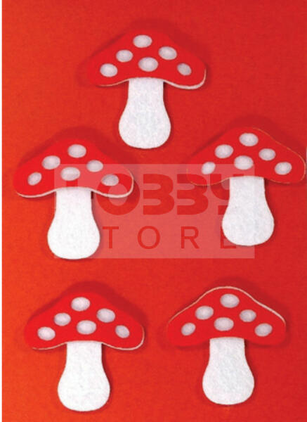 Filcfigura - Gomba (5 db/cs, átm. kb. : 6 cm) 23229 A barkácsfilcek és a hobbi filcek rengeteg színárnyalatban kaphatóak. Ragasztható, varrható, ideális bábok, füzetborítók, képek, rátétek könnyű és gyors elkészítéséhez és díszítéséhez. Használhatóak táskák és különböző textil termékek, dekorgumik díszítéséhez is. Különösen ajánlott óvodásoknak, kisi