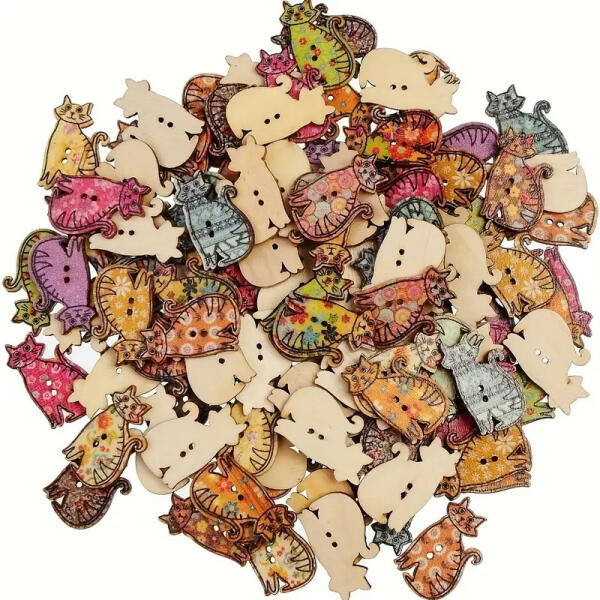 25 db cicás dekorációs fa gomb, kreatív célra Színe : Vegyes színek és minták Mérete :30 x 18 mm Szép, festett, cica formájú fa gombok vegyes színekben, absztrakt motívumokkal. Élénk színeinek köszönhetően széles körűen felhasználható. Ajánljuk scrapbookhoz, varrható, ragasztható, és bármilyen díszítéshez felhasználható. A csomag vegyes színekből kerül össze