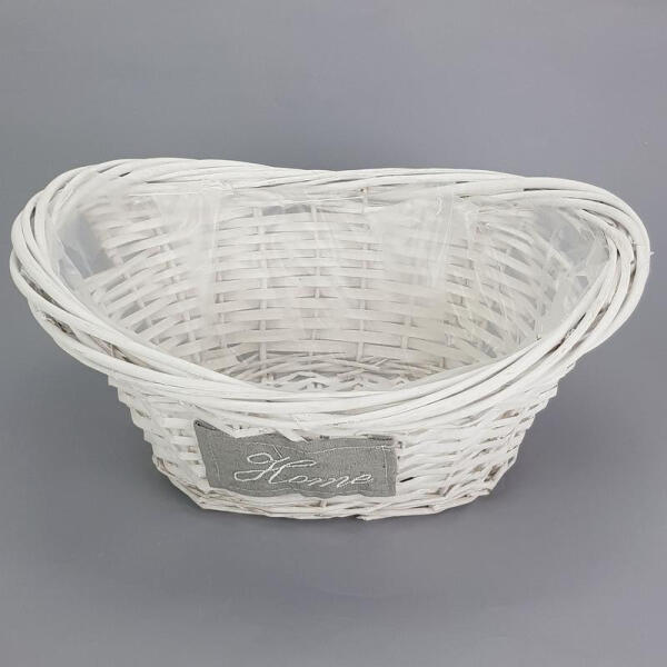Ovál erős vesszőből fonott fehér kosár, oldalán rejtett füllel. Bélelt, oldalán szövet címke "Home" felirattal. Méret : 39x30cm, mag:15/18cm (A kosár méretében +-1-2 centis eltérések lehetnek)