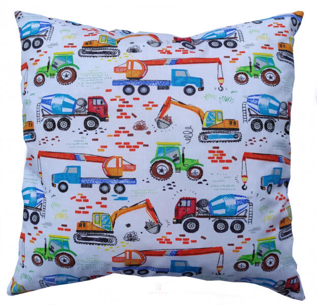 Munkagépes töltött díszpárna. Anyaga 100% pamut. A pamut súlya 180g/m Töltet 100% poliészter. Mérete 39x39 cm. Melyik kisfiú ne szeretné a munkagépeket. Nekik ez a párna egészen biztosan tetszeni fog. A mintán láthatunk traktort, betonkeverőt, lánctalpas markolót és darus kocsit. Mosás max 40 C-on Vasalható, mosógépben mosható. Szárítógépben normál hőmérsékleten sz