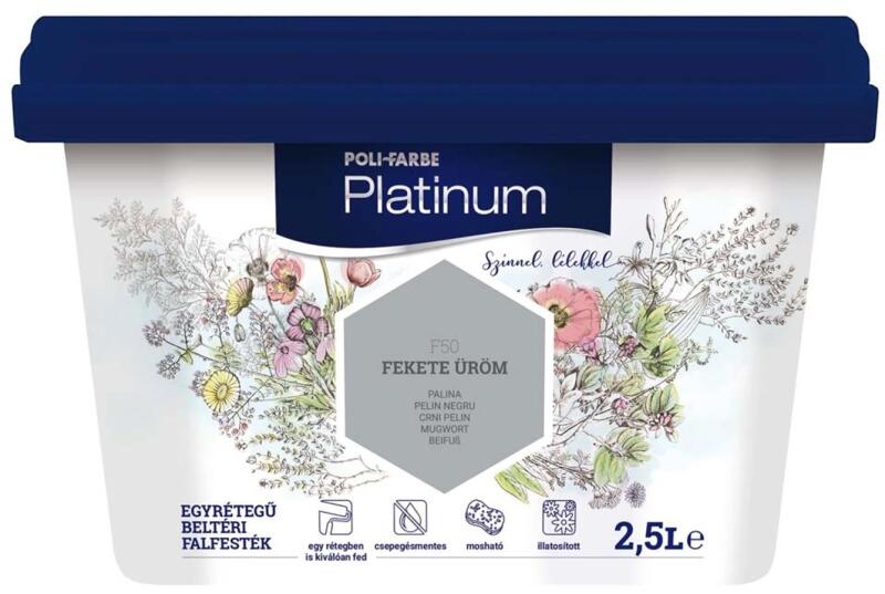 Poli-Farbe Platinum beltéri diszperziós falfesték Fekete üröm 2,5 l. Extra nagy fedőképességű, akár egy rétegben is. Gélesített, csepegésmentes. Bevonata matt, tartós, könnyen tisztítható. Kiszerelés: 2,5 l.