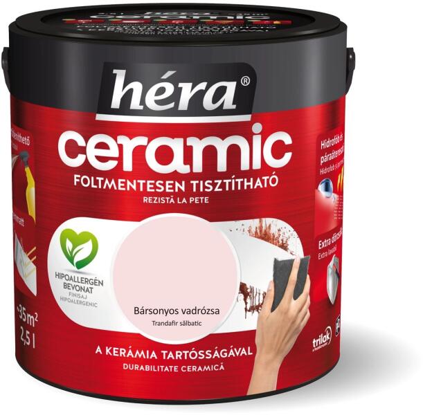 A Héra Ceramic speciális mikrokerámia-gyöngy tartalmának köszönhetően a legellenállóbb Héra beltéri falfesték, mely egészségügyi minősítéssel is rendelkezik! A kerámia technológia kimagasló mosás-és dörzsállóságot biztosít a felületnek, így téve azt foltmentesen tisztíthatóvá és fertőtleníthetővé. A Héra Ceramic falfesték hidrofób alkotórészei révén v
