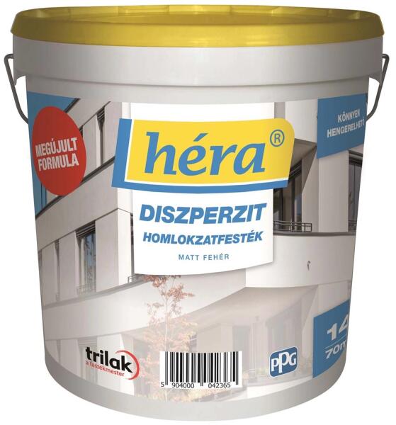 Héra Diszperzit homlokzatfesték. Matt vékony rétegű homlokzatfesték vakolt és beton felületekre. Páraáteresztő. 14 liter fehér. Színezhető.