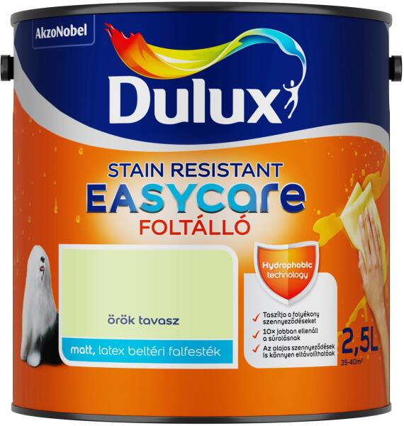 A Dulux EasyCare az első, forradalmi víztaszító tulajdonságú, foltálló beltéri falfesték. A festék egyedülálló összetételének köszönhetően a falról lepereg a víz és a legtöbb folyékony szennyeződés, amelyek így nem hatolnak mélyen a bevonatba. Rendkívül ellenálló felületet hoz létre, amelyről gyerekjáték a kosz eltávolítása. 48 színben kapható. Alkalmazá