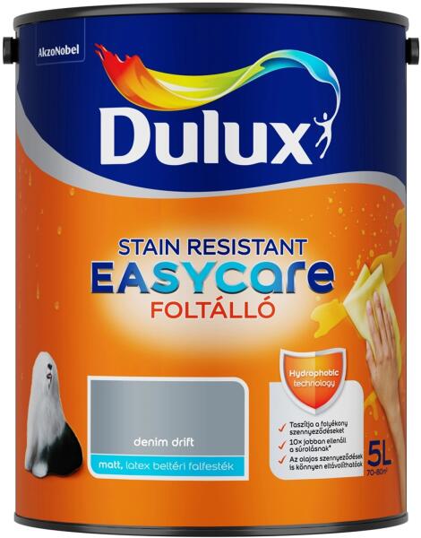 DZ Easycare Denim Drift 5 l. Forradalmi víztaszító tulajdonságú beltéri falfesték. A festék egyedülálló összetételének köszönhetően a falról lepereg a víz és a legtöbb folyékony szennyeződés, amelyek így nem hatolnak mélyen a bevonatba. Rendkívül ellenálló felületet hoz létre, amelyről gyerekjáték a kosz eltávolítása.