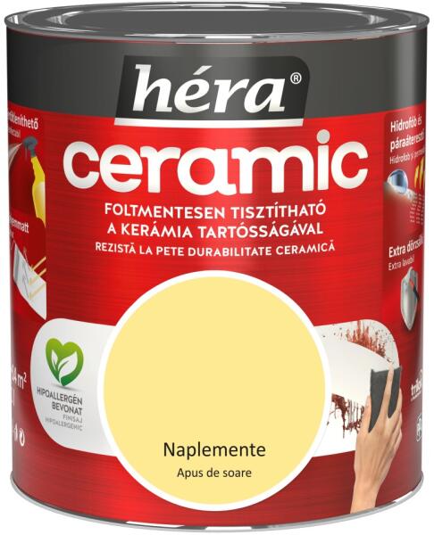 A Héra Ceramic speciális mikrokerámia-gyöngy tartalmának köszönhetően a legellenállóbb Héra beltéri falfesték. A kerámia technológia kimagasló mosás- és dörzsállóságot biztosít a felületnek, így téve azt foltmentesen tisztíthatóvá és fertőtleníthetővé. A Héra Ceramic falfesték hidrofób alkotórészei révén vízlepergető bevonatot képez, miközben innovatív