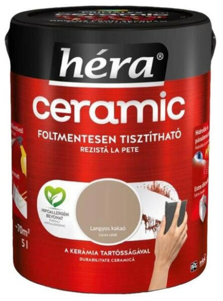 A Héra CERAMIC tisztítható beltéri falfesték, Langyos kakaó árnyalatban, az otthonok új kedvence. Ez a festék nem csupán szép, de praktikus is: a kerámia tartósságával bír, foltmentesen tisztítható és hipoallergén bevonatot biztosít. Az innovatív hidrofób és páraáteresztő tulajdonságainak köszönhetően a falak lélegeznek, miközben megóvják a felületeket a nedvess