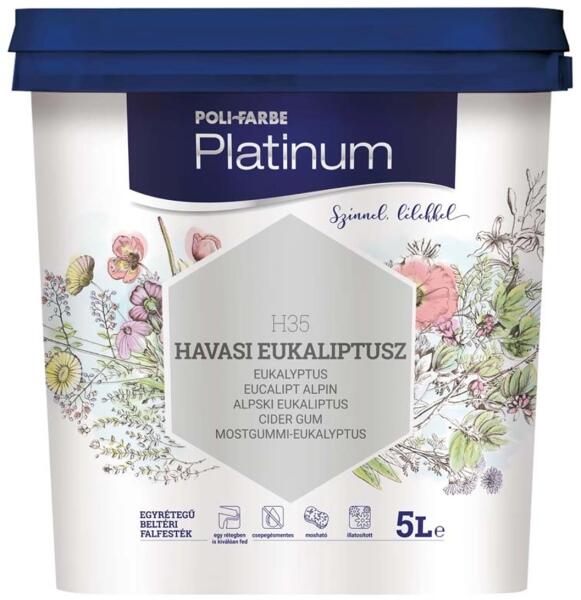 Poli-Farbe Platinum beltéri diszperziós falfesték Havasi eukaliptusz 5 l. Extra nagy fedőképességű, akár egy rétegben is. Gélesített, csepegésmentes. Bevonata matt, tartós, könnyen tisztítható. Kiszerelés: 5 l.