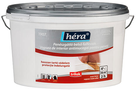Héra Penészgátló fehér színű, matt, biocid tartalmú beltéri falfesték. Alkalmazható megelőző védelem céljából, vagy megfelelő előkészítés után a már szennyezett felületeken is. Biocid tartalmával meggátolja a penészgomba és algafoltok kialakulását, valam