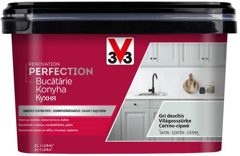 V33 Renovation Perfection vizes bázisú konyhai felújító festék, világosszürke színben, 2l kiszerelésben. Kiváló minőségű felújító festék belső terekbe. Használható nyers, lakkozott és festett fából készült konyhabútorokon és bútorlapokon, munkalapon, falicsempéken és háztartási gépeken. Munkalapoknál a festéket be kell vonni munkalap lakkal. Tulajdonságok - K