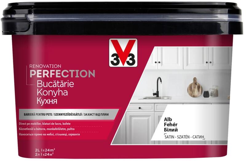V33 Renovation Perfection vizes bázisú konyhai felújító festék, fehér színben, 2l kiszerelésben. Kiváló minőségű felújító festék belső terekbe. Használható nyers, lakkozott és festett fából készült konyhabútorokon és bútorlapokon, munkalapon, falicsempéken és háztartási gépeken. Munkalapoknál a festéket be kell vonni munkalap lakkal. Tulajdonságok - Közvetlen