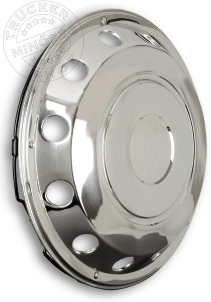 Magasfényű fém dísztárcsa 22,5 colos kerékre. Domború kialakítása miatt (kerékagy) az első kerékre is felszerelhető. Rögzítőgyűrűs felfogatás (a rögzítőgyűrűt, a gumibakokat és a rögzítő csavarokat a csomag tartalmazza). Anyaga: polírozott rozsdamentes acél (inox).