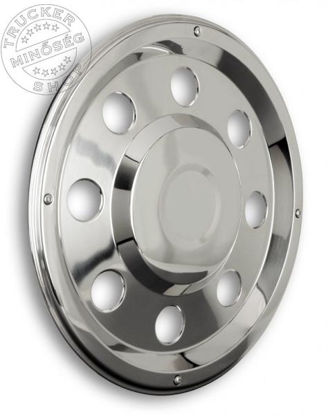 Magasfényű fém dísztárcsa 19,5 colos kerékre. Homorú kialakítása miatt a hátsó (dupla) kerékre javasolt. Rögzítőgyűrűs felfogatás (a rögzítőgyűrűt, a gumibakokat és a rögzítő csavarokat a csomag tartalmazza). Anyaga: polírozott rozsdamentes acél (inox).