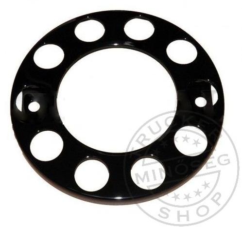 Dísztárcsa karika (kerékagyfedő) 22,5 colos kerékre, lyukas közepű. Két csavaros felfogatás, tíz csavaros kerékre. Anyaga: porfestett acél.