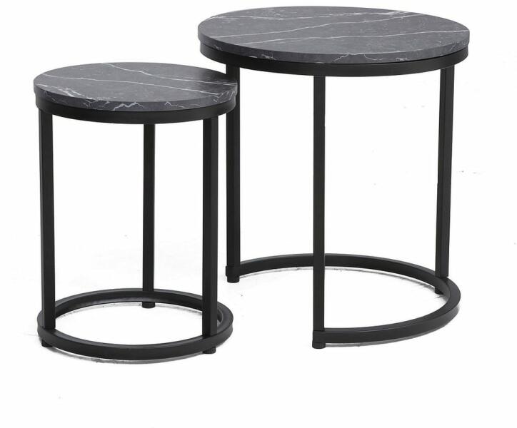 Hola dohányzóasztal A Hola egy 2, azonos kialakítású, de különböző méretű dohányzóasztalból álló készlet. Egyrészt elegáns megjelenésű, másrészt lehetővé teszi, hogy a kisebb asztalt részben vagy teljesen a nagyobb alá csúsztassa, és helyet takarítson meg. Mindkét asztal laminált forgácslapból készült kör alakú tetejük van, amelyet fekete fém talp támaszt m