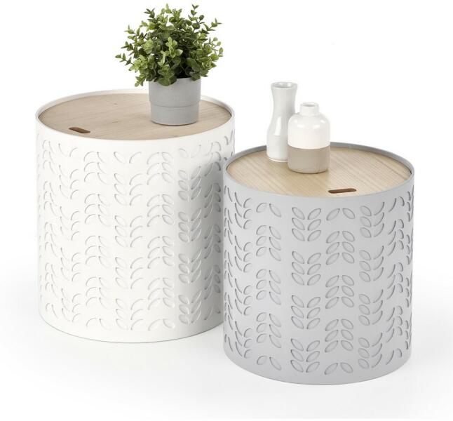 Alba dohányzóasztal A két Alba dohányzóasztalból álló készlet boldoggá tesz üzlethelyiségben és otthon is. Egy nagyobb, 39 átmérőjű asztalból és egy 35 cm átmérőjű kisebbből áll. Mindkettőben van tárhely > amely a felső levehető lemez alatt található. Az asztalok szerkezete lakkozott MDF lapokból, a fedél pedig tömör fából készült. A fedélen található f