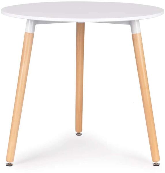 MODERN SZKANDINÁVIAI Asztal a ModernHome-tól - 80 cm átmérőjű asztallap - Tartós bükkfa lábak - Matt fehér munkalap - Stabil konstrukció - Állítható gumilábak - Gyorsan összeszerelhető SKANDINÁV DESIGN Az egyszerű skandináv dizájnnak köszönhetően az asztal minden belső térben vonzóan mutat. Az érdekes forma, a gondos kivitelezés és a funkcionalitás tökéletes kombin