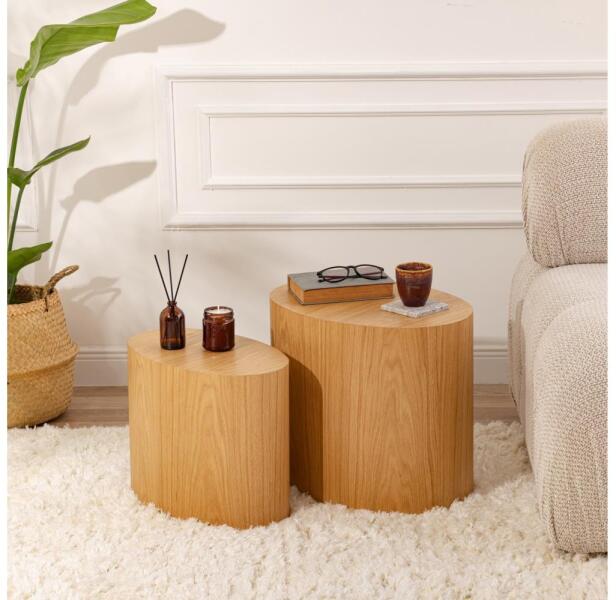 Két asztalból álló készlet a kéznél lévő dolgok tárolására. Az egyszerű, modern stílusnak köszönhetően bármilyen otthonba illik. Két különböző méretben. Melamin forgácslapból készült. A nagyobb asztal méretei: 49 x 40 x 34 cm. A kisebb asztal méretei: 41 x 33 x 25 cm. Ez a bútordarab teljesen összeszerelve érkezik, összeszerelés nem szükséges.